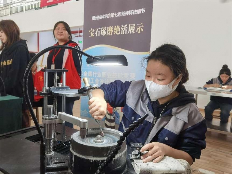 “这是刚在全国工业设计大赛中获得三等奖的学生杨欣彤同学。”工艺美术系副主任李卫对前来观摩的学院领导、企业领导及师生介绍道,“她正在展示的是宝石琢磨技术。杨欣彤在师生的围观下,仍全神贯注地打磨着手中的宝石,观摩师生不禁发出阵阵赞叹……
