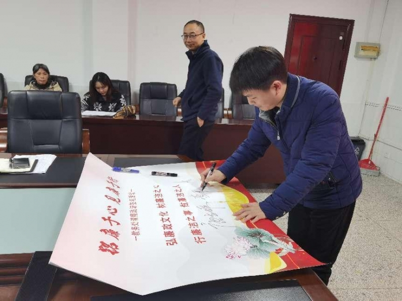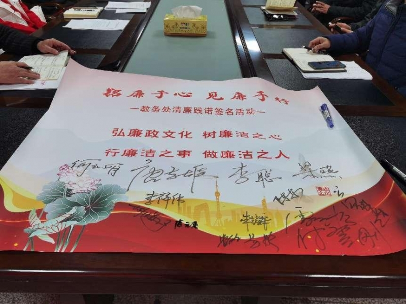 为提醒全体工作人员严守党纪法规,自觉增强纪律规矩意识,全力营造崇廉尚廉的良好氛围,教务处还组织开展了“清廉践诺”签名活动,全体工作人员依次在“铭廉于心,见廉于行”的承诺活动面板上郑重写下自己的名字。